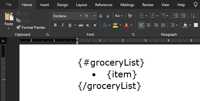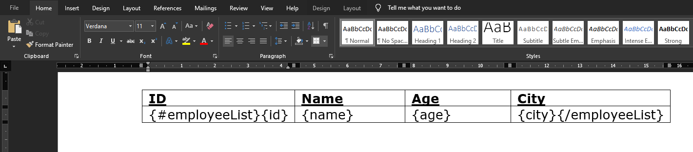 {#employeeList}, ensure there is no whitespace like this{#employeeList }, as this can cause the program to fail. - Microsoft Word can automatically add spaces so be aware of that.