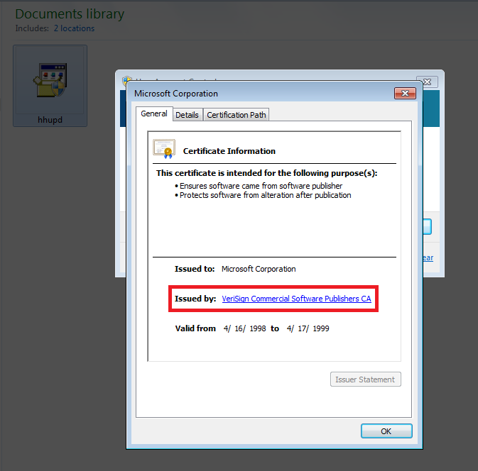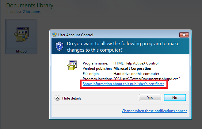 Click Show details or Show more details, and click the link that says Show information about this publisher's certificate